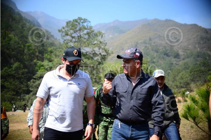 Los gobernadores de Nuevo León y Coahuila, Samuel García y Miguel Riquelme, respectivamente, se reunieron para coordinar los vuelos de pruebas con el avión DC-10Air Tanker que hará descargas de agua en la Sierra de Santiago para combatir el incendio forestal. FOTO: ENRIQUE TERRAZAS/CUARTOSCURO.COM