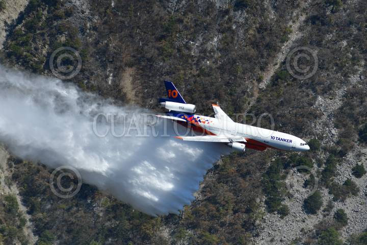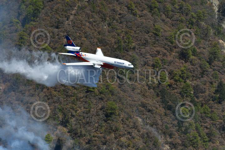 Se realizaron pruebas con el avión DC-10Air Tanker que hará descargas de agua en la Sierra de Santiago para combatir el incendio forestal que afecta esta zona desde hace varios días. FOTO: ENRIQUE TERRAZAS/CUARTOSCURO.COM