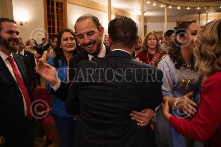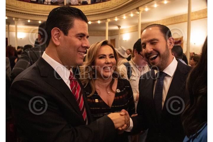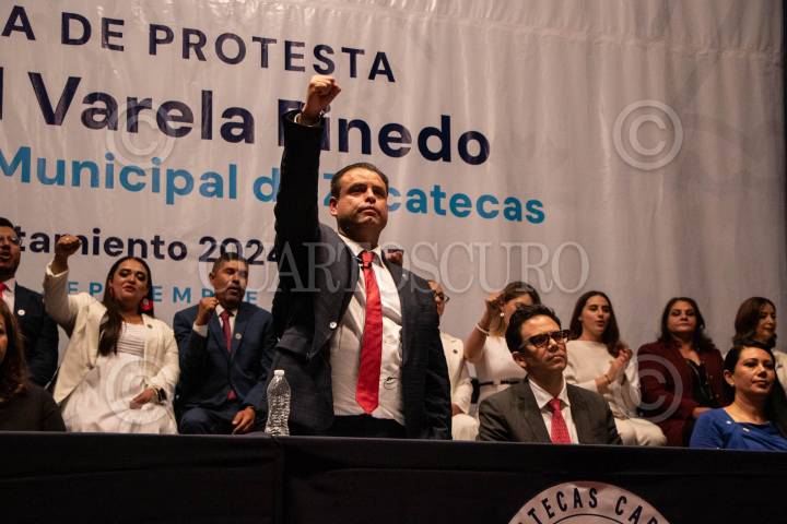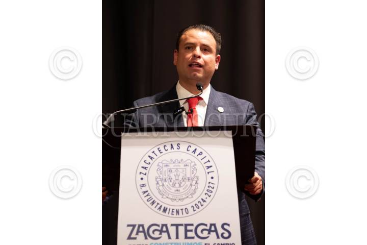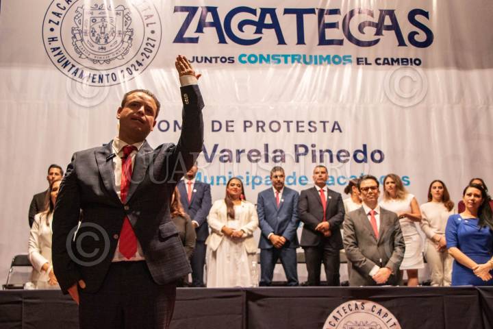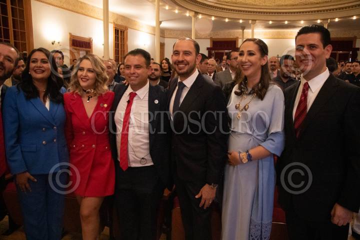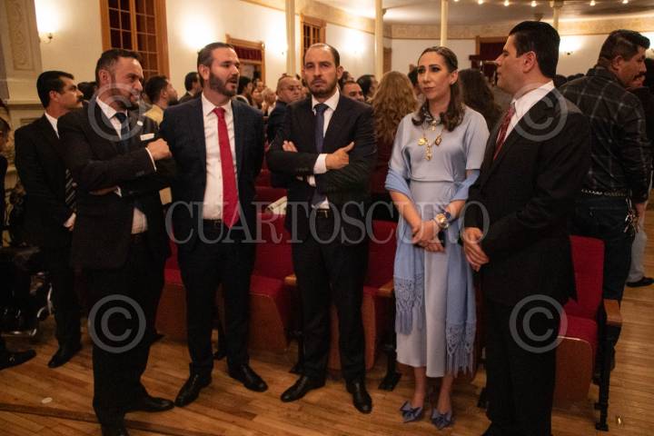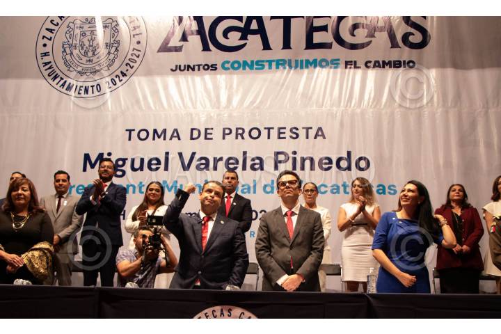 ZACATECAS, ZACATECAS, 15SEPTIEMBRE2024.- Miguel Varela Pinedo, rindió protesta como Presidente Municipal de Zacatecas 2024-2027; después de que el Tribunal Electoral del Poder Judicial de la Federación (TEPJF), avaló la elección del panista, tras unas serie de impugnaciones. El Teatro Calderón, de la capital zacatecana, fue el recinto en donde Rodrigo Reyes, secretario de gobierno, en representación del gobernador, tomó la protesta al político de la alianza PAN-PRI-PRD y en la cual se dieron cita invitados que presenciaron las ceremonia; dentro de los acompañantes de Varela, se encontraba Miguel Alonso Reyes, exgobernador y diputado federal por el PRI, Marko Cortez, senador y presidente nacional del PAN, entre otros. FOTO: ADOLFO VLADIMIR /CUARTOSCURO.COM