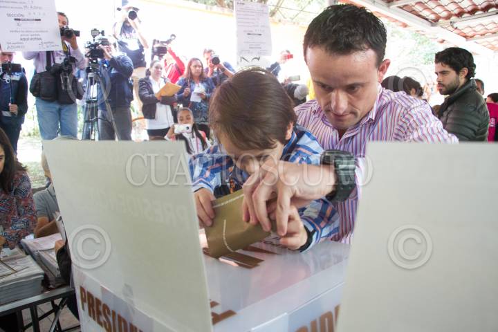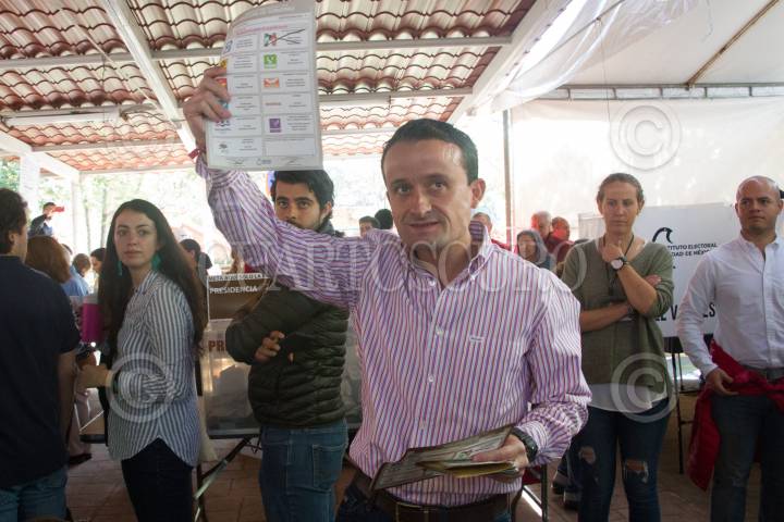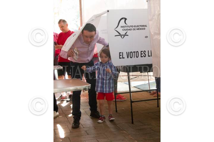 CIUDAD DE MÉXICO, 01JULIO2018.- Mikel Arriola, candidato a jefe del Gobierno de la Ciudad de México, durante su votación esta mañana. Acudió acompañado de su hijo Santiago y de su esposa. FOTO: VICTORIA VALTIERRA / CUARTOSCURO.COM
