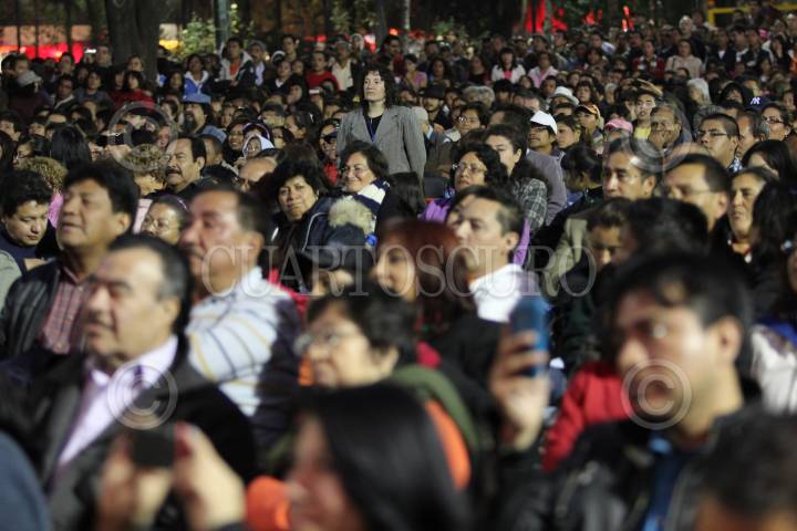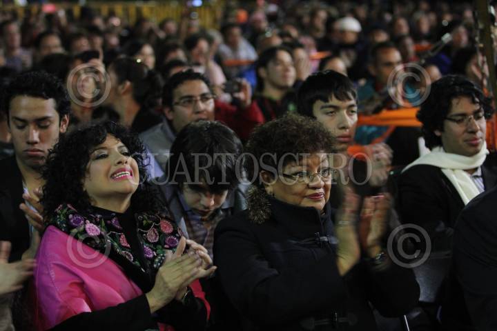 MEXICO, D.F., 18DICIEMBRE2010.- Clara Brugada, jefa delegacional en Iztapalapa, aplaude a Pablo Milanés, compositor cubano, quien se presentó ante cientos de seguidores en la explanada de la delegación Iztapalapa como parte del "Festival Fuego Nuevo". FOTO: MISAEL VALTIERRA/CUARTOSCURO.COM