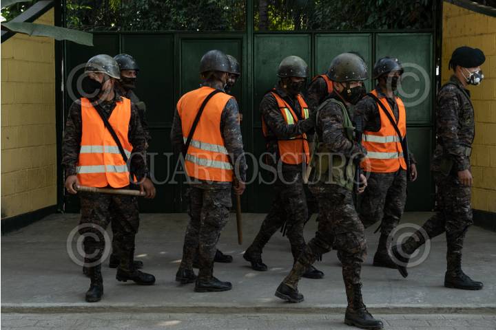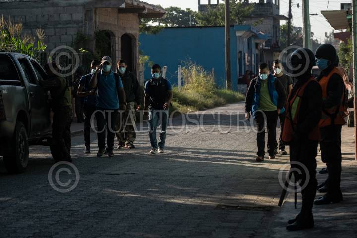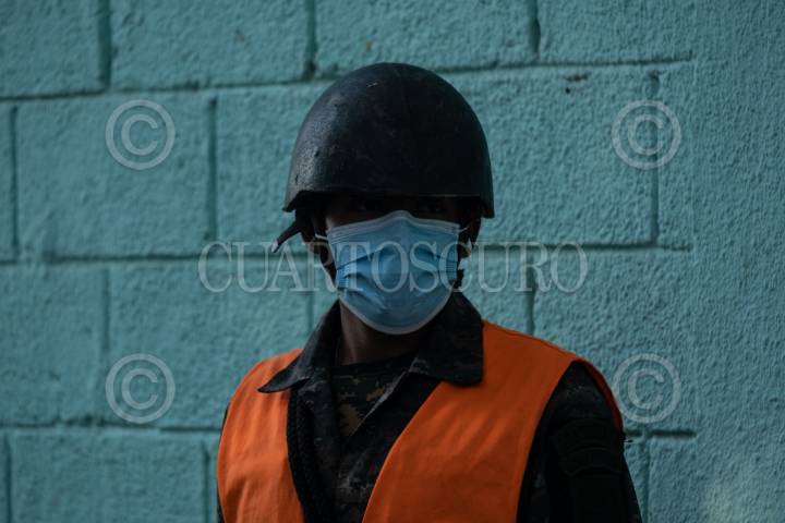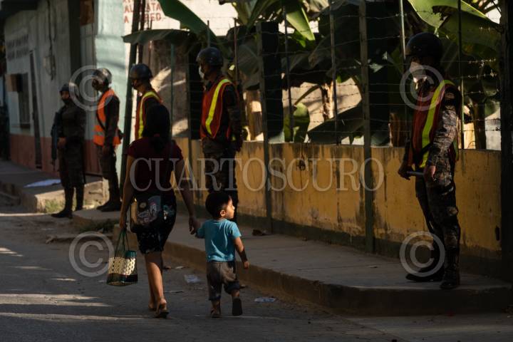 Una familia guatemalteca camina frente a elementos del Ejercito Nacional.