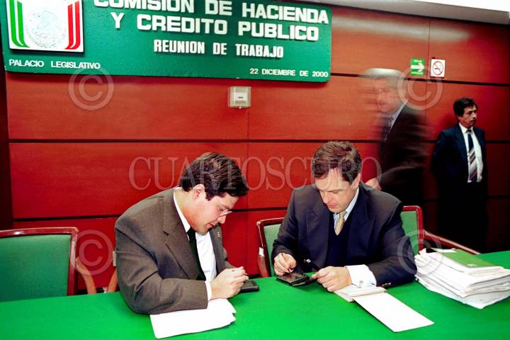 Los legisladores integrantes de la comisión de Hacienda y Crédito Público, del PAN Manuel Minjares y del PRI Jorge Chavez analizan con calculadoras el presupuesto. FOTO: Victoria Valtierra/CUARTOSCURO.COM