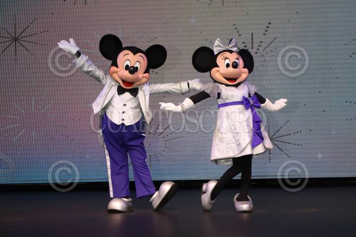 Los personajes Mickey Mouse y Minnie Mouse durante la conferencia del espectáculo “Disney 100 en concierto” en el Lunario del Auditorio Nacional.