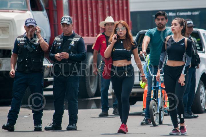 CIUDAD DE MÉXICO, 09MAYO2018.- Dos mujeres caminan sobre la calle canal de Apatlaco mientras son observadas por un grupo de hombres. FOTO: DIEGO SIMÓN SÁNCHEZ /CUARTOSCURO.COM