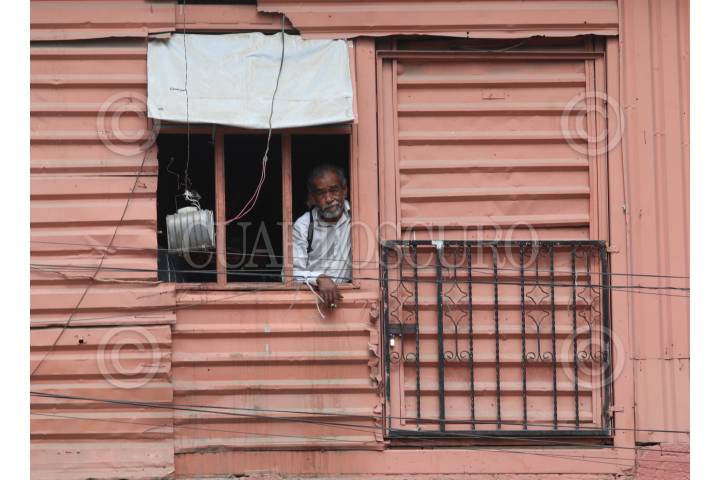Hombre observa desde lo alto de una ventada la llegada de vecinos de la colonia Guerrero a la plaza en donde se espera el arribo de la Jefa de Gobierno.