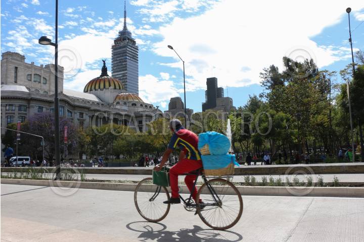 Vendedor de tacos de canasta que viaja sobre si bicicleta, mira desde Avenida Hidalgo, la Torre Latinoamericana y la padre trasera de la cúpula de Bellas Artes acompañadas de un juego de nubes.