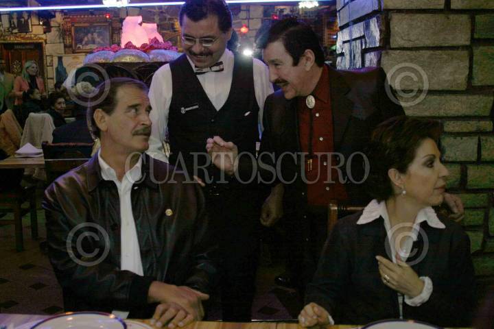 Monterrey, Nuevo Leon 11 ENERO 2004.- Vicente Fox y Marta Sahagún escuchan las sugerencias del menú de Jesús Alberto Martinez propietario de El Rey del Cabrito, donde comieron después de ir a misa de medio día en la catedra, previó a su participación de mañana como anfitrión en la Cumbre de las Américas. FOTO: PEDRO VALTIERRA/CUARTOSCURO.COM