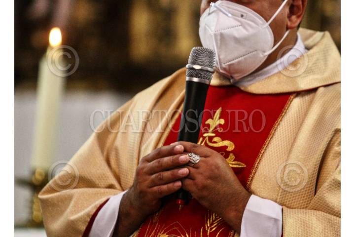 El Arzobispo Primado Carlos Aguiar Rete se lava las manos durante la misa, que fue a puerta cerrada como medida ante la alerta sanitaria por el Covid-19