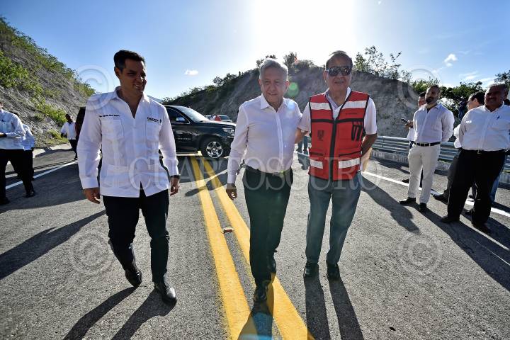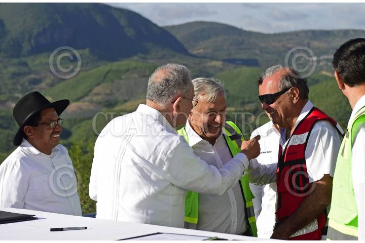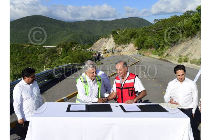 MITLA, OAXACA, 28JUNIO2019.- Andrés Manuel López Obrador, presidente de México en la Supervisión de la Carretera Mitla-Tehuantepec II que se localiza al oriente de la ciudad de Oaxaca y servirá para comunicar la capital del estado con el Istmo de Tehuantepec. Lo acompañaron Carlos Slim, director del grupo Carso, Jorge Mendoza Sánchez, titular de BANOBRAS, Adelfo Regino titular del INPI, Secretario de la SCT Javier Jiménez Espriú y Alejandro Murat, Gobernador de Oaxaca. FOTO: PRESIDENCIA /CUARTOSCURO.COM