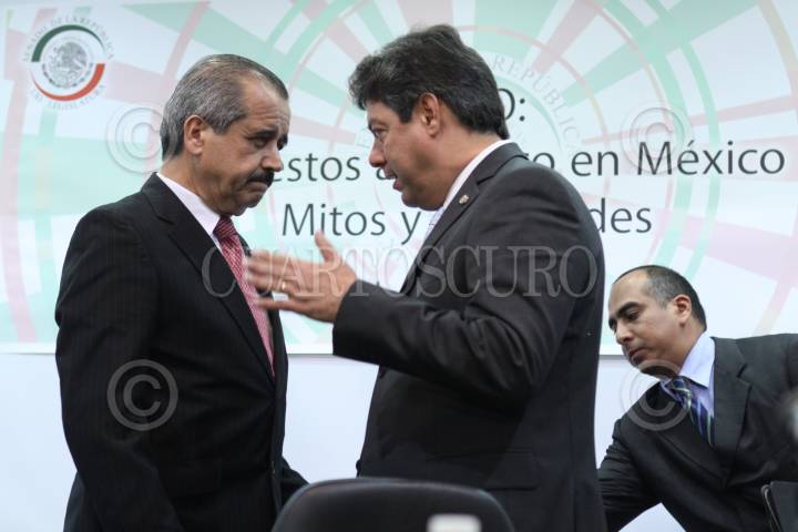 MÉXICO, D.F., 21JULIO2010.- José Ángel Cordova Villalobos, Secretario de Salud y Guillermo Tamborrel Suárez, al finalizar la ceremonia de inauguración del foro "Impuestos al tabaco en México Mitos y Realidades", en el Senado de la República. FOTO: MOISÉS PABLO/CUARTOSCURO.COM