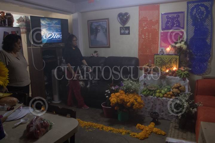 Una vecina del pueblo San Andrés Mixquic colocó objetos en la ofrenda de su hogar al sonar las campanas a las 12 del día como llegada de las almas de los difuntos