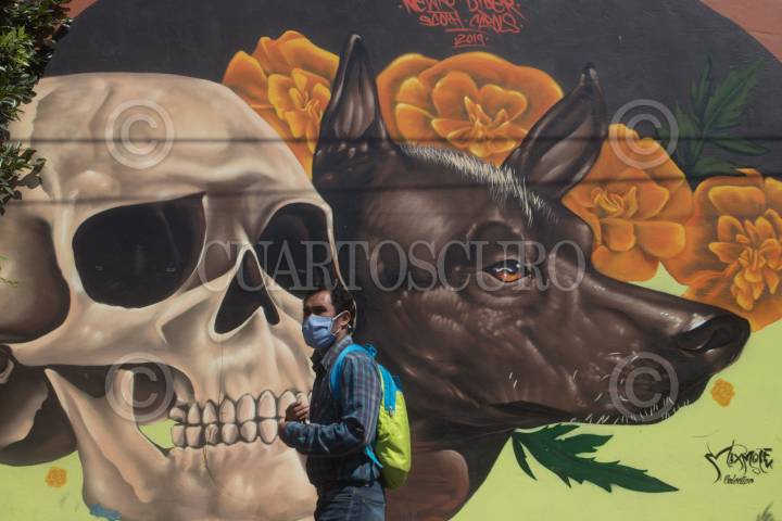 Un señor transito por los murales con motivo del Día de muertos en el pueblo de San Andrés Mixquic