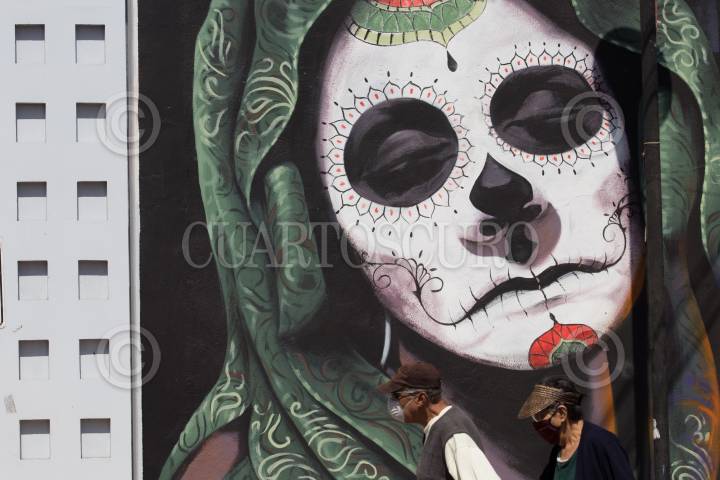 Una pareja transito por los murales con motivo del Día de muertos en el pueblo de San Andrés Mixquic