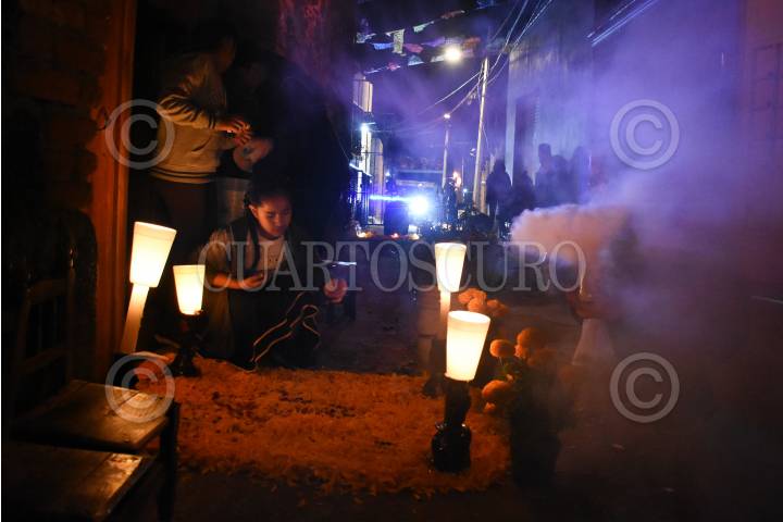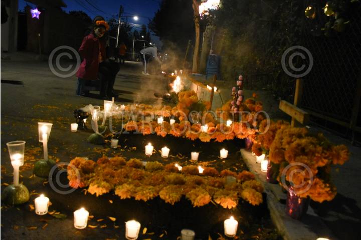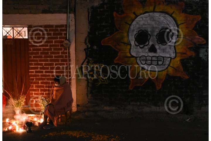 Los habitantes de San Andrés Mixquic no pudieron despedir a sus muertos con su tradicional alumbrada en el panteón debido a las restricciones sanitarias derivadas por la pandemia de Covid-19, por lo que colocaron sus ofrendas a fuera de su casa.