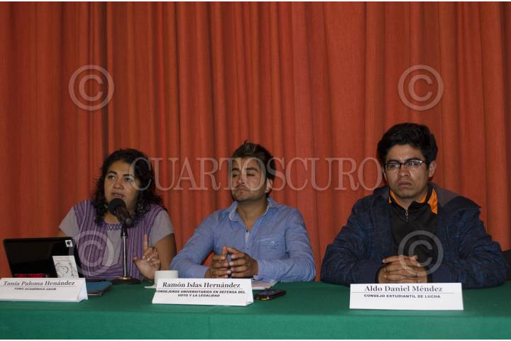 MÉXICO, D.F., 11OCTUBRE2012.- Tania Paloma Hernandéz, vocera del Foro Academica UACM, Ramón Islas Hernandéz, vocero de los consejeros universitarios en defensa del voto y la legalidad, y Aldo Daniel Méndez del Consejo Estudiantil de Lucha dieron está mañana una conferencia en el Centro Nacional de Comunicación Social CENCOS para informar sobre la violación al proceso electoral del Tercer Consejo Universitario, este hecho hace que se retrase la solución al conflicto, por lo que en la tarde habra otra mesa de diálogo en donde estara la Comisión Mixta. FOTO: SANDRA PÉREZ /CUARTOSCURO.COM
