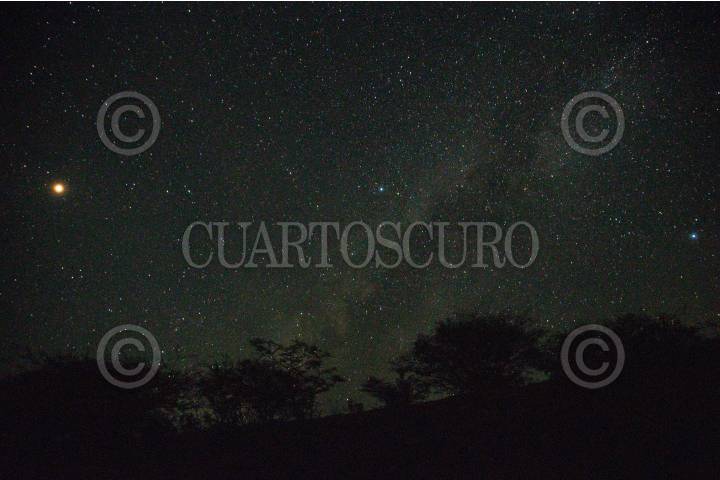 CHIAUTLA DE TAPIA, PUEBLA 22JULIO2018.- La vía láctea y los planetas Marte (a la izquierda), Saturno (centro) y Júpiter (derecha) durante el amanecer en un paraje de la Sierra Mixteca cerca de San Juan de los Ríos. FOTO: MARGARITO PÉREZ RETANA /CUARTOSCURO.COM