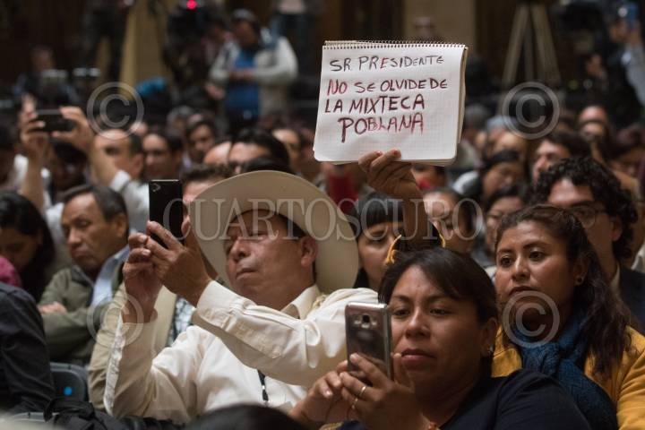 CIUDAD DE MÉXICO, 17MARZO2019.- Una ciudadana le pide al Presidente de México "no se olvide de la Mixteca Poblana", durante la ceremonia de clausura del Foro Nacional "Planeación Juntos la Transformación de México", realizado en el Palacio Nacional. FOTO: MOISÉS PABLO /CUARTOSCURO.COM