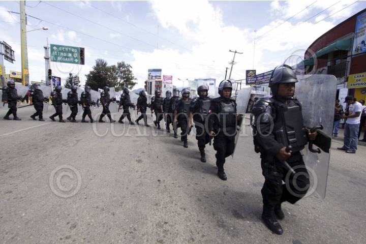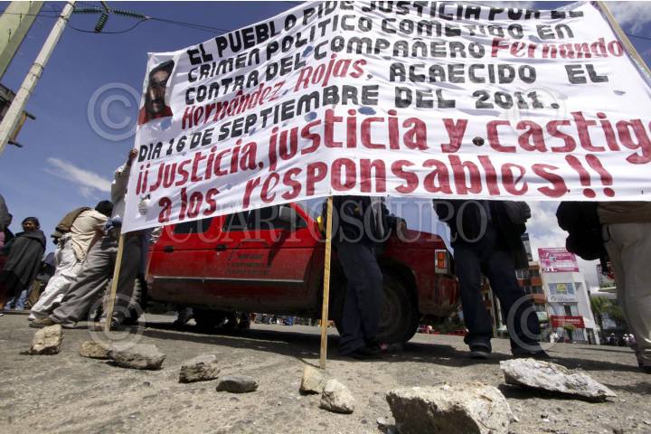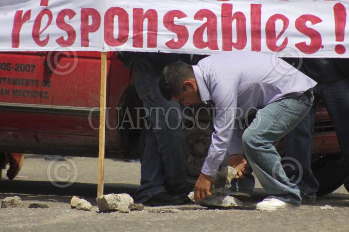 OAXACA, OAXACA, 04OCTUBRE2011.- Por lo menos 100 habitantes pertenecientes al municipio de San Juan Mixtepec, población ubicada en la región de la Mixteca, realizaron un bloqueo en el crucero de 5 Señores en la ciudad, para exigir justicia en el homicidio de Fernando Hernández Rojas, quien fuera asesinado el pasado 16 de septiembre en dicha comunidad. A dicho sitio arribaron elementos de la Policía Estatal, no se presentaron enfrentamientos entre los bandos. FOTO: ARTURO PÉREZ ALFONSO/CUARTOSCURO.COM