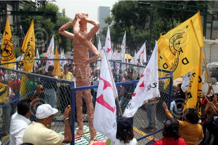 MÉXICO, D.F., 28JUNIO2007.- Miembros del grupo "Los de Abajo" y simpatizantes del PRD colocaron un "monumento al funcionario autista" frente a la Secretaría de Gobernación, en apoyo a la huelga de hambre que realiza el senador Héctor Miguel Bautista López. FOTO: ISAAC ESQUIVEL/CUARTOSCURO.COM