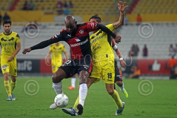 GUADALAJARA, JALISCO. 16FEBRERO2015.- Leandro Lujan jugador de Murciélagos disputa un balón a Felipe Baloy de Atlas, durante el partido correspondiente a la Jornada 4 del Torneo Clausura 2016 de la Copa MX, entre los Zorros del Atlas y los Murciélagos de los Mochis, en el estadio Jalisco. FOTO : FERNANDO CARRANZA GARCIA / CUARTOSCURO