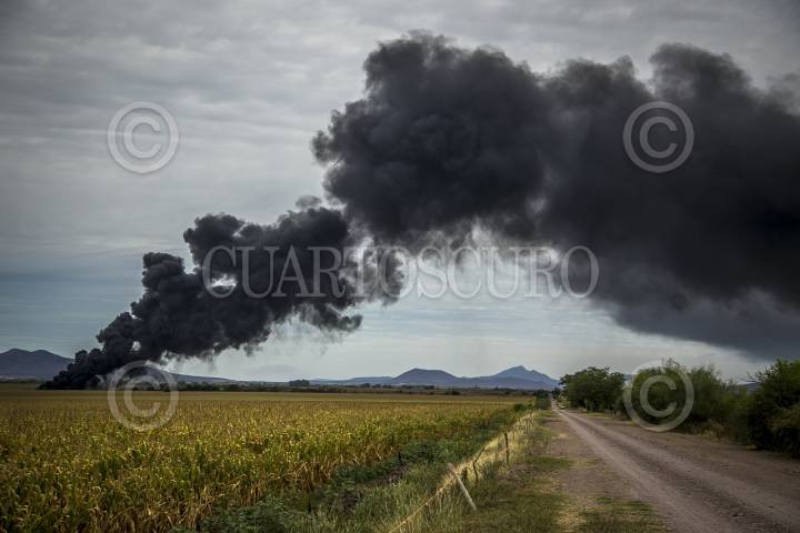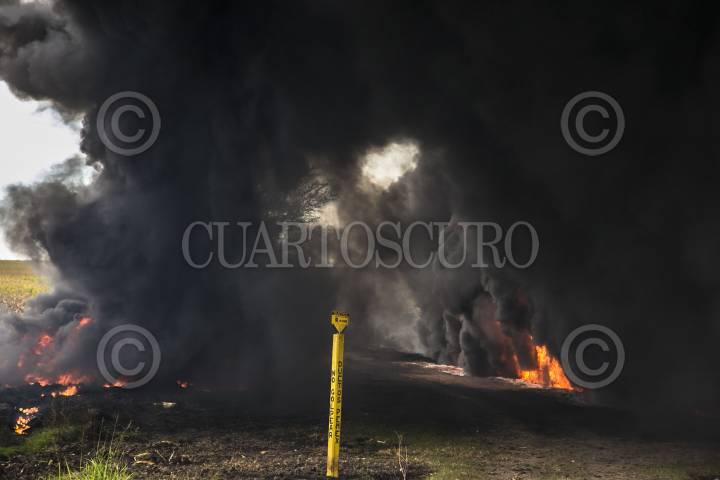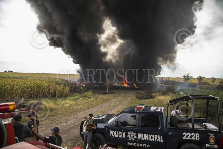 MOCORITO, SINALOA, 22ABRIL2015.- Una explosión de una toma clandestina de combustible en las inmediaciones del poblado Calomato a un costado de campos de maíz, dejó como saldo una persona herida la cual fue llevada al hospital, se presume que la víctima se dedicaba a la ¨ordeña¨ de combustible, elementos de bomberos y diferentes corporaciones policiacas acudieron al lugar para controlar el siniestro. FOTO: RASHIDE FRIAS / CUARTOSCURO.COM