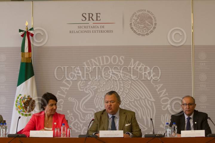 CIUDAD DE MÉXICO, 20MARZO2018.- Anne Grillo, embajadora de Francia de México; Francisco del Río, directora general para Europa, y Mohamed Chafiki, embajador de Marruecos en México, durante la presentación de actividades durante la semana de la Francofonía en México, que se realizó en la cancillería. FOTO: MOISÉS PABLO /CUARTOSCURO.COM