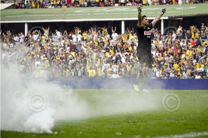 MÉXICO, D.F., 11MAYO2013.- Moisés Muñóz, portero del América festeja el segundo gol de la victoria de América, durante el partido correspondiente a los Cuartos de Final del Torneo Clausura 2013 de la Liga MX entre las Aguílas del América en contra de los Pumas de la UNAM y llevado acabo en el estadio Azteca. FOTO: MISAEL VALTIERRA / CUARTOSCURO.COM