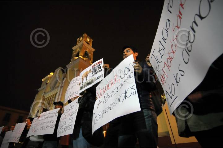 XALAPA, VERACRUZ, 26ENERO15.- Periodistas de diversos medios de comunicación se concentraron en la Plaza Lerdo para exigir justicia en el caso del reportero y activista Moisés Sánchez, extendiendo su solidaridad con la familia del periodista desaparecido, quien a casi un mes de haber sido desaparecido, sigue sin ser hallado, pues se desconfía de que los restos presentados este fin de semana, sean suyos. Los comunicadores exigieron también un alto a la violencia contra la prensa en el estado, siendo este el más peligroso para realizar la profesión pues en lo que va del gobierno de Javier Duarte van 10 periodistas asesinados y hasta el momento 5 desaparecidos. FOTO: RUBÉN ESPINOSA / CUARTOSCURO.COM
