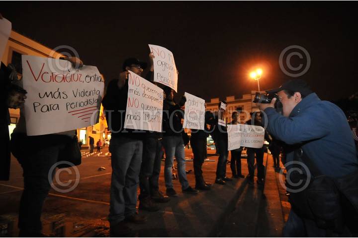 XALAPA, VERACRUZ 26ENERO15.- Periodistas de diversos medios de comunicación se concentraron en la Plaza Lerdo para exigir justicia en el caso del reportero y activista Moisés Sánchez, extendiendo su solidaridad con la familia del periodista desaparecido, quien a casi un mes de haber sido desaparecido, sigue sin ser hallado, pues se desconfía de que los restos presentados este fin de semana, sean suyos. Los comunicadores exigieron también un alto a la violencia contra la prensa en el estado, siendo este el más peligroso para realizar la profesión pues en lo que va del gobierno de Javier Duarte van 10 periodistas asesinados y hasta el momento 5 desaparecidos. FOTO: RUBÉN ESPINOSA / CUARTOSCURO.COM