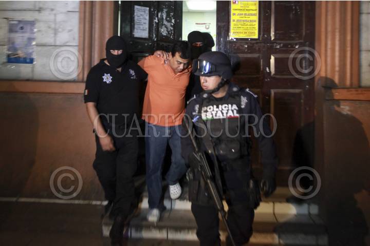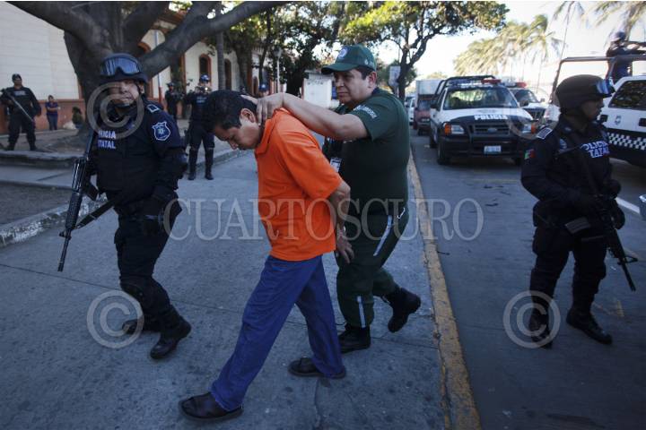 VERACRUZ, VERACRUZ, 28ENERO2015.- El escolta y chofer del alcalde de Medellín de Bravo y los dos motopatrulleros de la policial municipal, quienes están sujetos a proceso por la desaparición y muerte del reportero Moisés Sánchez Cerezo, fueron presentados en la Agencia Quinta del Ministerio Público para declarar en torno a los hechos. FOTO: FÉLIX MÁRQUEZ / CUARTOSCURO.COM