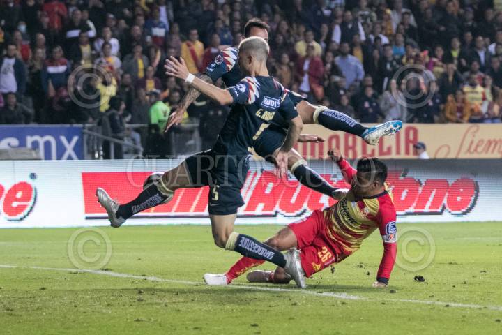 Martín Rodríguez (Monarcas) y Alan Mozo (Pumas) disputan un balón en el medio campo