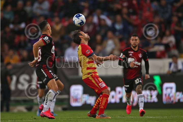 GUADALAJARA, JALISCO, 06FEBRERO2020.- Jesús Isijara jugador de Atlas disputa un balón con el contrario José Ortiz de Monarcas, esto en partido correspondiente a la Jornada 5 del Torneo Clausura 2020 de la Liga MX, en donde se enfrentan los Zorros del Atlas frente a las Monarcas Morelia, en partido que se lleva a cabo en el Estadio Jalisco, el marcador al momento es de 1-0 a favor del equipo visitante. FOTO: FERNANDO CARRANZA GARCIA / CUARTOSCURO.COM