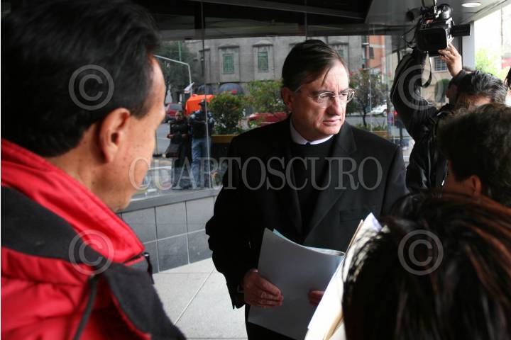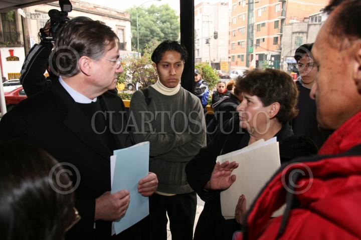 MÉXICO D.F., 15ENERO2009.- El periodista José Gutiérrez Vivó, espera la llegada de notificadora-ejecutora Gabriela García de la delegación sur del IMSS, quien asistiría a embragar las instalaciones de Diario Monitor. En la imagen dialoga con unas persona que le reiteran su apoyo. FOTO: GUILLERMO PEREA/CUARTOSCURO.COM