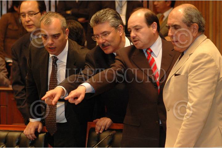MÉXICO D.F., 05JULIO2009.- Los consejeros electorales Alfredo Figueroa, Arturo Sanchez; Felipe Solis del PRI, el Senador Pablo Gomez, consejero del poder legislativo PRD observan un monitor con resultados del PREP antes de la reanudación de la sesión permanente que se realizo esta noche en el salón de plenos del Instituto Federal Electoral (IFE) en este día de jornada electoral que se celebro en todo el país. FOTO: RODOLFO ANGULO/CUARTOSCURO.COM