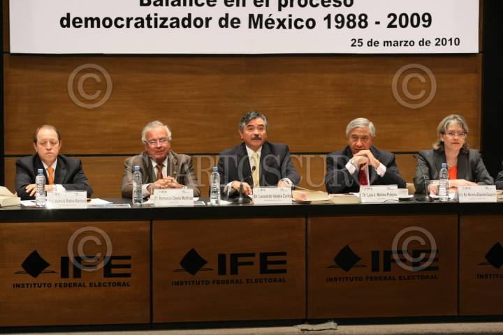 MÉXICO, D.F., 25MARZO2010.- Marco Antonio Baños Martínez, consejero, Fernando Ojesto Martínez, Leonardo Valdés Zurita, consejero presidente, Luis Molina Piñeiro y Macarita Elizondo Gasperín, consejera, durante la presentación del libro: “Monitor Democrático, Balance en el Proceso Democratizador de México 1988-2009”, esto en la sede del IFE. FOTO: CUARTOSCURO.COM