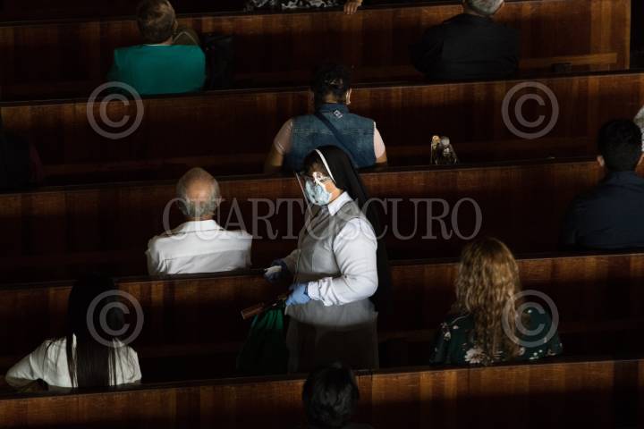 Una monja porta un cubrebocas durante la misa en la Basílica de Guadalupe