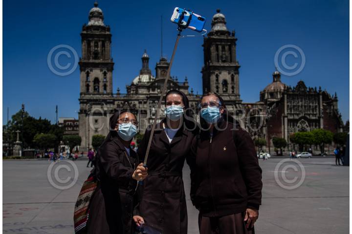 Un grupo de tres mujeres con habito se toman una "selfie" en la plancha del Zócalo con el fondo de la Catedral Metropolitana.