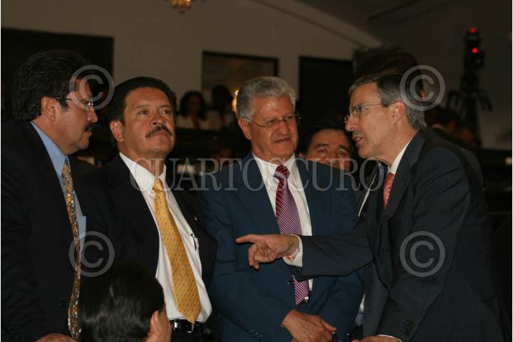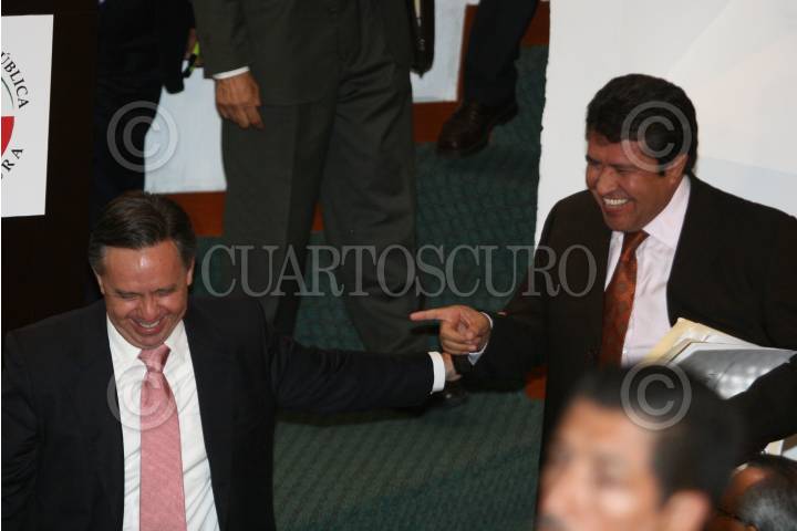 MÉXICO D.F. 10ABRIL2007.-Arturo Nuñez Jimenez, Ricardo Monrreal, Carlos Navarrete senadores del PRD, Francisco Arroyo Vieyra y Manlio Fabio Beltrones del PRI dialogan, durante la sesión del senado de la república. FOTO: GUILLERMO PEREA/CUARTOSCURO.COM