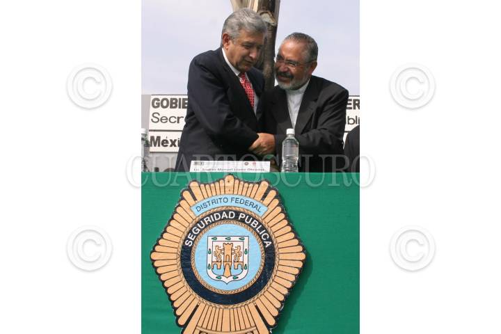 MEXICO, D.F. 21JULIO2005.- Andrés Manuel López Obrador, jefe de Gobierno capitalino, es saludado por el rector de la Basílica, Diego Monrroy, al inicio de la ceremonia de ascenso a policias, realizada en el Deportivo Miguel Alemán. FOTO: Sandra Perdomo/CUARTOSCURO.COM