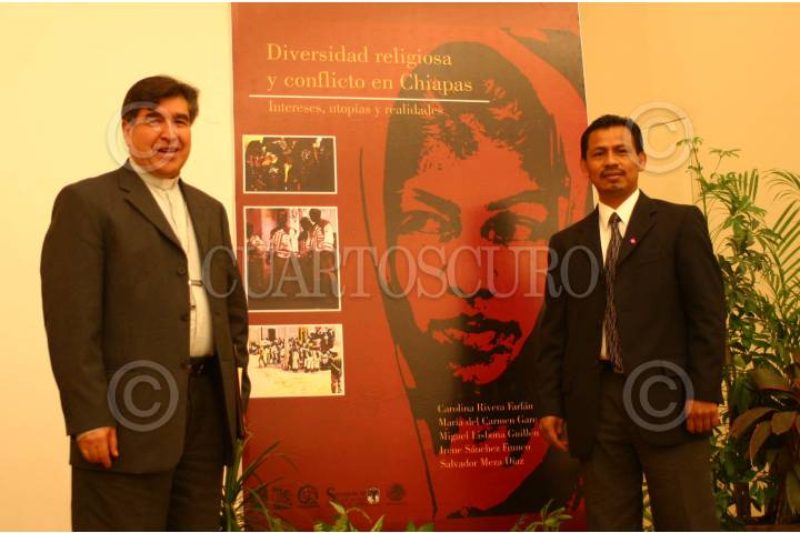 MÈXICO,D.F.11MAYO2006.- Mons. Felipe Arizmendi Esquivel, Arzobispo de San Cristobal de las Casas y Pastor Hortencio Vàzquez durante la entrega de registros constitutivos y presentaciòn del libro "Diversidad religiosa y Conflicto en Chiapas. Intereses, Utopìas y Realidades" que se llevò a cabo en la SEGOB. FOTO: M. Tulia Pèrez Bocanegra/CUARTOSCURO.COM