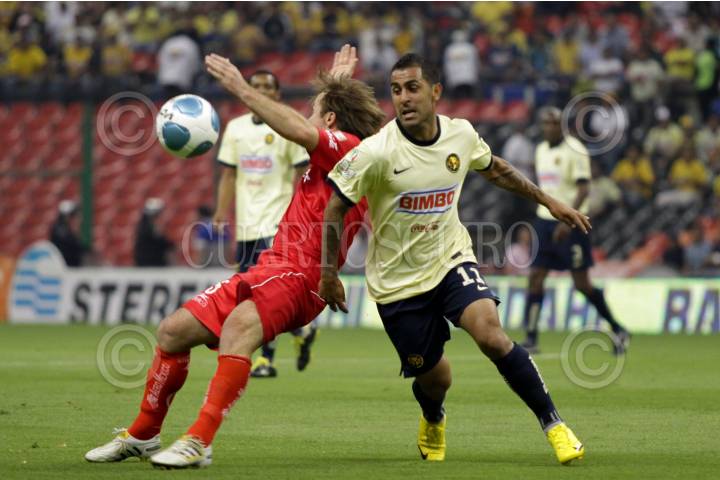 MÉXICO, D.F., 02MAYO2010.- Daniel Montenegro de las Aguilas del America busca el balÛn durante el encuentro en contra de los Diablos del Toluca en el partido de cuartos de final del Torneo Bicentenario que se realizo en el estadio Azteca quedando el marcador empatado a 2 goles. FOTO: RODOLFO ANGULO/CUARTOSCURO.COM