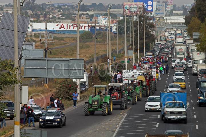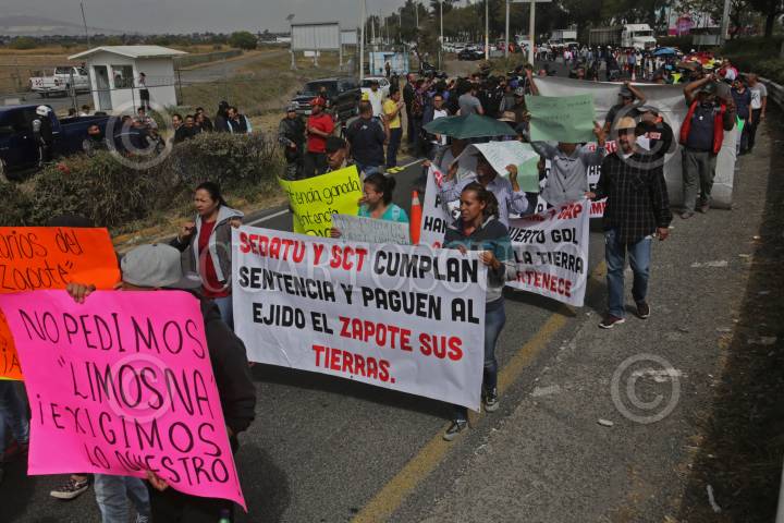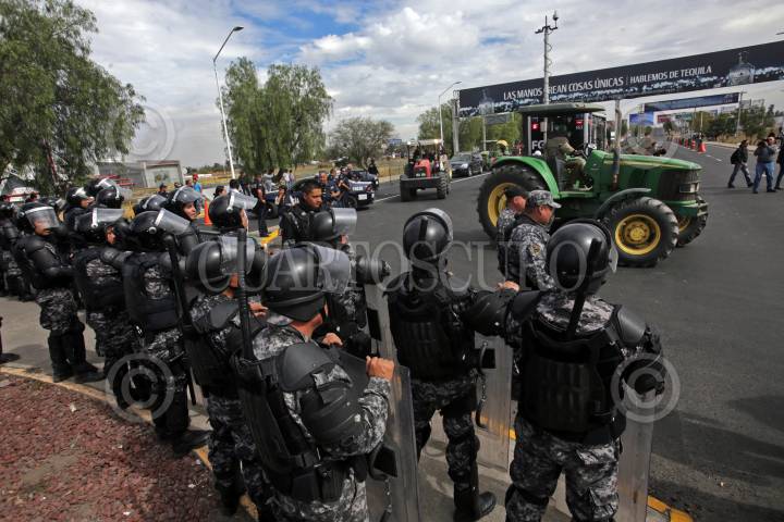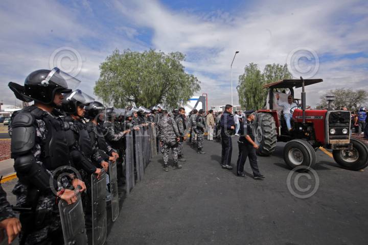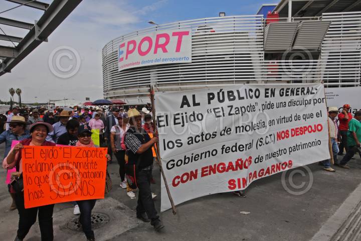 GUADALAJARA, JALISCO. 18ENERO2017.- Ejidatarios del poblado de El Zapote nuevamente protestaron y exigen un pago justo por sus tierras. Desde tempranas horas, alrededor de 200 ejidatarios marcharon del parque Montenegro hacia el Aeropuerto Internacional Miguel Hidalgo, en donde se manifestaron y mantendrán un plantón permanente, por lo que elementos de antimotines y policías federales resguardaron los alrededores de las inmediaciones de la terminal aérea, para evitar que los manifestantes tomaran las instalaciones del Aeropuerto. FOTO : FERNANDO CARRANZA GARCIA / CUARTOSCURO.COM
