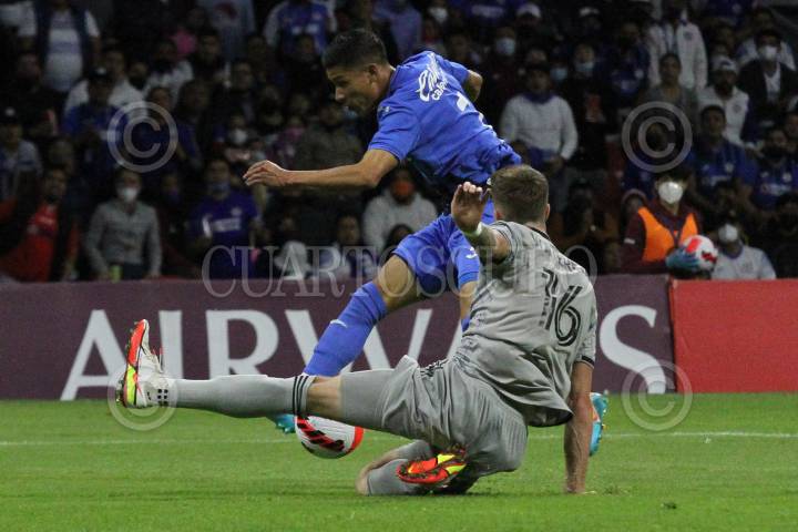 Adrián Aldrete, defensa lateral del Cruz Azul, remata el balón tras la cobertura de Zachary Brault-guillard, en partido de ida de los cuartos de final de de la Liga de Campeones Concacaf 2022.