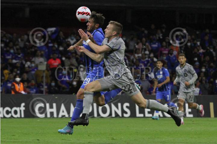 Carlos Rodríguez, mediocampista del Cruz Azul enfrenta la marca de Joel Waterman, defensa del Montréal en partido de ida de los cuartos de final de de la Liga de Campeones Concacaf 2022.