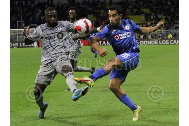 Uriel Antuna, delantero del Cruz Azul realiza un disparo frente a la marca de Joel Waterman, defensa de Montréal en partido de ida de los cuartos de final de de la Liga de Campeones Concacaf 2022.
