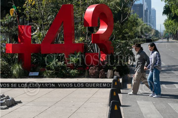 CIUDAD DE MÉXICO, 31DICIEMBRE2023.- Monumento a las 43 normalistas desaparecidos desde el 2016 en Iguala, Guerrero, ubicado en avenida Reforma. El Gobierno de Andrés Manuel López Obrador anunció que abrirá el expediente del 'caso Ayotzinapa' durante dos meses a los padres de los 43 jóvenes. FOTO: MOISÉS PABLO/CUARTOSCURO.COM