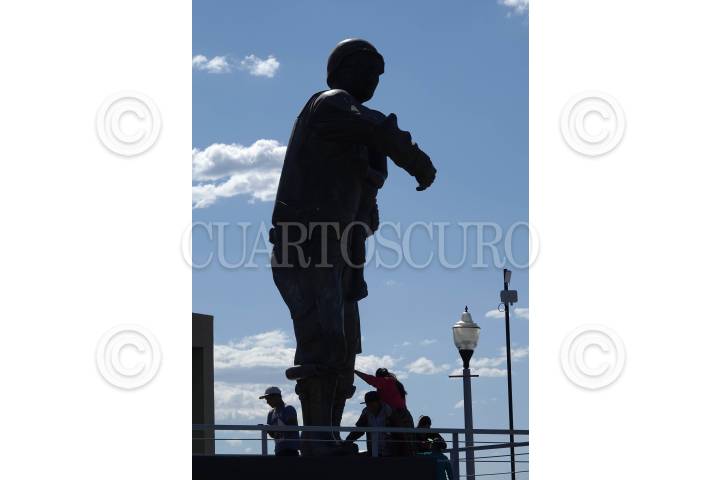 CHIHUAHUA, CHIHUAHUA, 21SEPTIEMBRE2024.- Las siluetas de un grupo de personas se observa en el Monumento al Policía Caído en Cumplimiento de su deber en el centro de la ciudad de Chihuahua. FOTO: GALO CAÑAS/CUARTOSCURO.COM