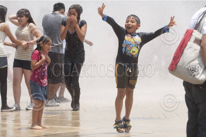 MEXICO,DF., 05MAYO2012.- El Servicio Meteorológico Nacional pronosticó una máxima de 29 Grados Centígrados, con probabilidad de lluvia por la tarde. Un niño se divierte con la fuente de agua que funciona en la explanada del Monumento a la Revolución y que refrescó a cientos de visitantes. FOTO: FRANCISCO RODRÍGUEZ /CUARTOSCURO.COM