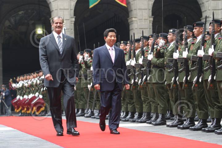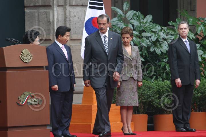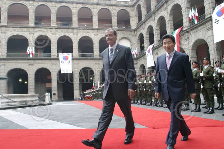 MEXICO, D.F. 09SEPTIEMBRE2005.- El presidente Vicente Fox y Roh Moo Hyun presidente de la República de Corea, caminan por el patio central del Palacio Nacional durante la ceremonia de bienvenida al mandatario coreano. FOTO: Nelly Salas/CUARTOSCURO.COM